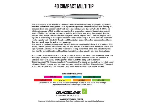 The 4D Compact Multi Tip line is the best and most economical way to get your rig correct from the start when fishing with Multi Tip Shooting Heads connected to a Shooting Line. This set-up consists of a floating 4D Compact Body and a mesh wallet with a set of three interchangeable tips of various sink rates (H/I, S1/S3 and S3/S5) for efficient targeting of fish at different depths. It is a complete range of lines that covers all kinds of fishing from single handed to Switch and all the way up to fishing with double handed rods, except the heaviest line weights and the longest rods. The 4D Compact line is super easy to manage and cast due to its short length. It has a powerful taper and works equally well with both Scandi- and Skagit style casts.