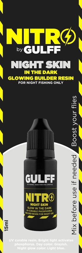 NIGHT SKIN is a phosphorus streamer body builder which glows in the dark. It attracts predator fish and makes your flies visible in the night time. The glowing colour is light blue and without glowing effect the color is reyish. For night fishing only.