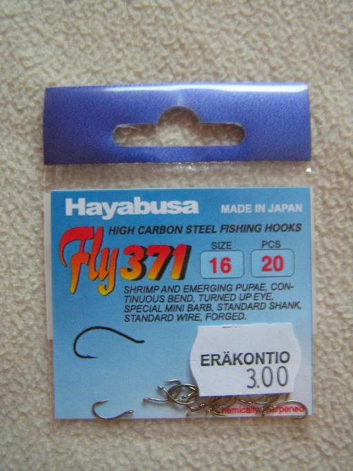 Hayabusan kemiallisesti teroitetut Fly371 perhokoukut, 20kpl pussissa. Shrimp/Pupa-koukku. Ylä-silmäinen koukku. Koot:16.