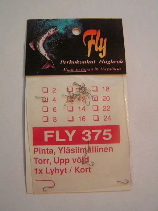 Hayabusan kemiallisesti teroitetut Fly375 perhokoukut, 20kpl pussissa. Pinta-koukku. Yläsilmäinen koukku, 1xlyhyt. Koot:18 ja 20.