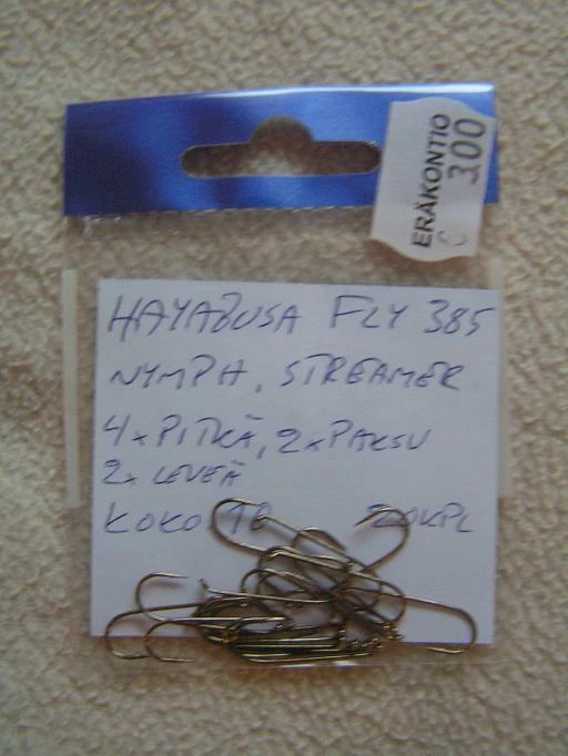Hayabusan kemiallisesti teroitetut Fly385 perhokoukut, 20kpl pussissa. Nymph/Streamer-koukku. Alasilmäinen koukku, 4xpitkä, 2xpaksu. Koot:10.