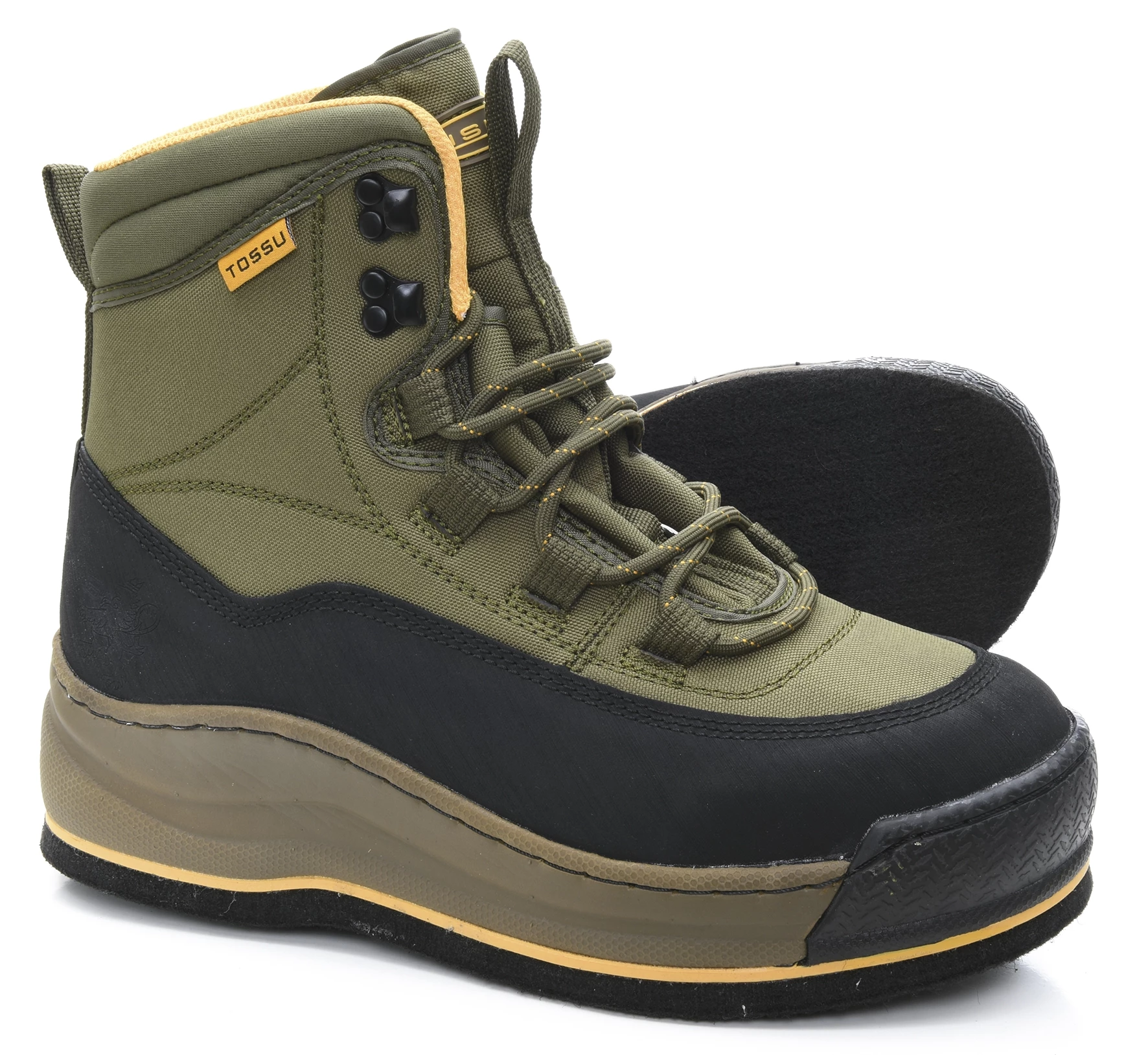 We wanted to develop a shoe with more rigid structure to support one’s foot in all possible conditions. Tossu has a totally new and unique moulded EVA midsole. The construction of this boot is done in a manner, which secures the upper part to the lower part extremely well due to both gluing and sewing the pieces together. The construction also enables easy, solid and safe attachment of Vision studs. It provides good ankle support and the front rubber bumper gives great protection against rocks. Available both with felt sole and new brown Gummi sole with improved grip.